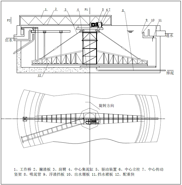 該設(shè)備采用中心傳動(dòng)、垂架式,污水進(jìn)入周邊配水槽內(nèi),經(jīng)槽底配水孔均勻流入池內(nèi),并在周邊擋水裙板的作用下,水流從池底流向中心,污泥依靠自重沉積于池底,從而形成泥水分離,驅(qū)動(dòng)裝置驅(qū)動(dòng)中心豎架旋轉(zhuǎn),并帶動(dòng)刮臂及吸泥管旋轉(zhuǎn),在靜水壓力的作用下,污泥均勻地進(jìn)入吸管上布置的吸口,然后通過中心排泥井的套筒閥排出池外。排泥量的大小可由套筒閥的升降度來控制,水面的浮渣通過撇清裝置撇向池邊,再由刮渣耙刮進(jìn)排渣斗內(nèi)排出池外。